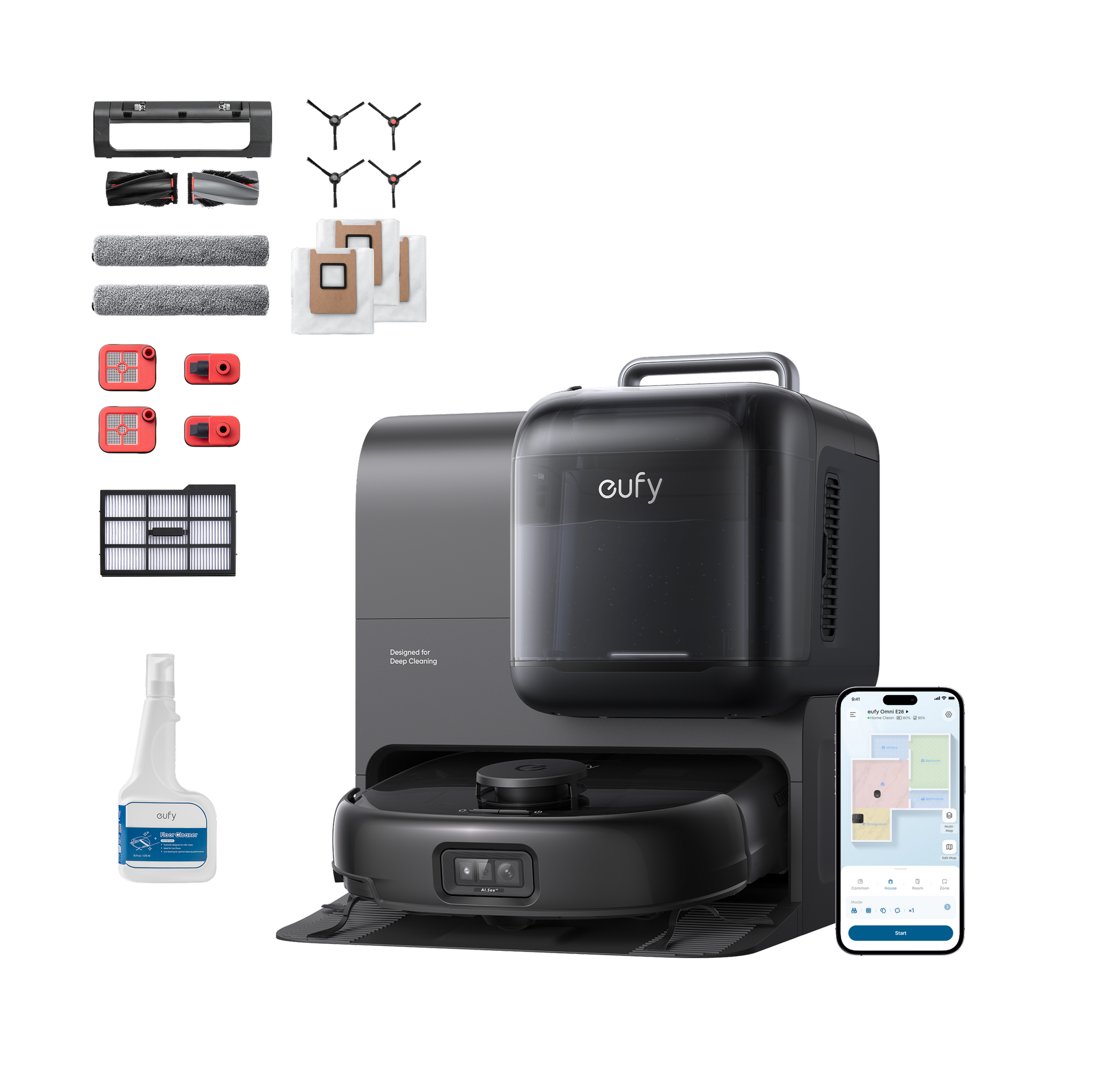 eufy Robot Vacuum Omni E28 with Complete Accessory Kit and cleaning solution