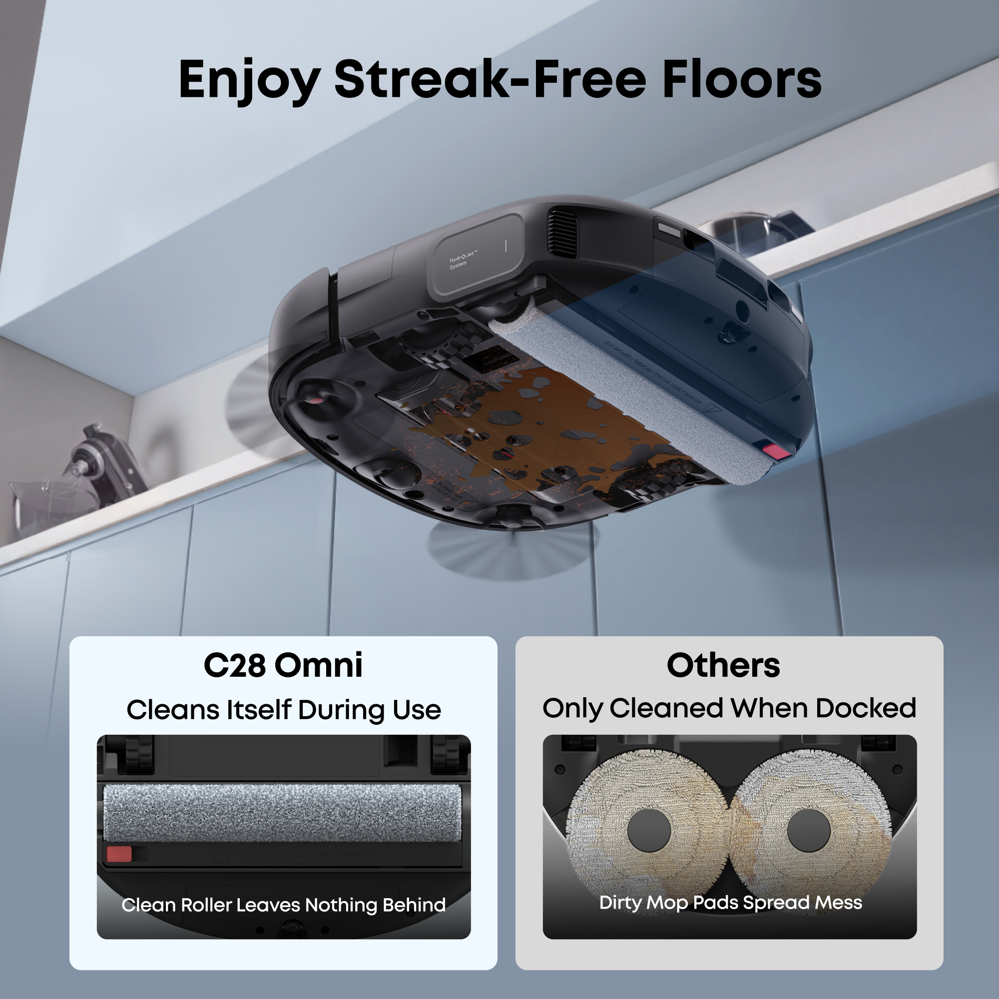 Roller mop cleans itself in real-time and scrubs with 1 kg of downward pressure to deliver spotless, streak-free floors.